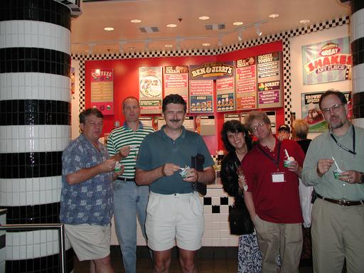 Ben and Jerry sure make a good scoop of ice cream. A bunch of 4D heavyweights go out for a snack. From left to right: Larry Sharpe, Rich Gay, John Macrae, Diana Nemirovsky, John Barrymore, and Lee Hinde.